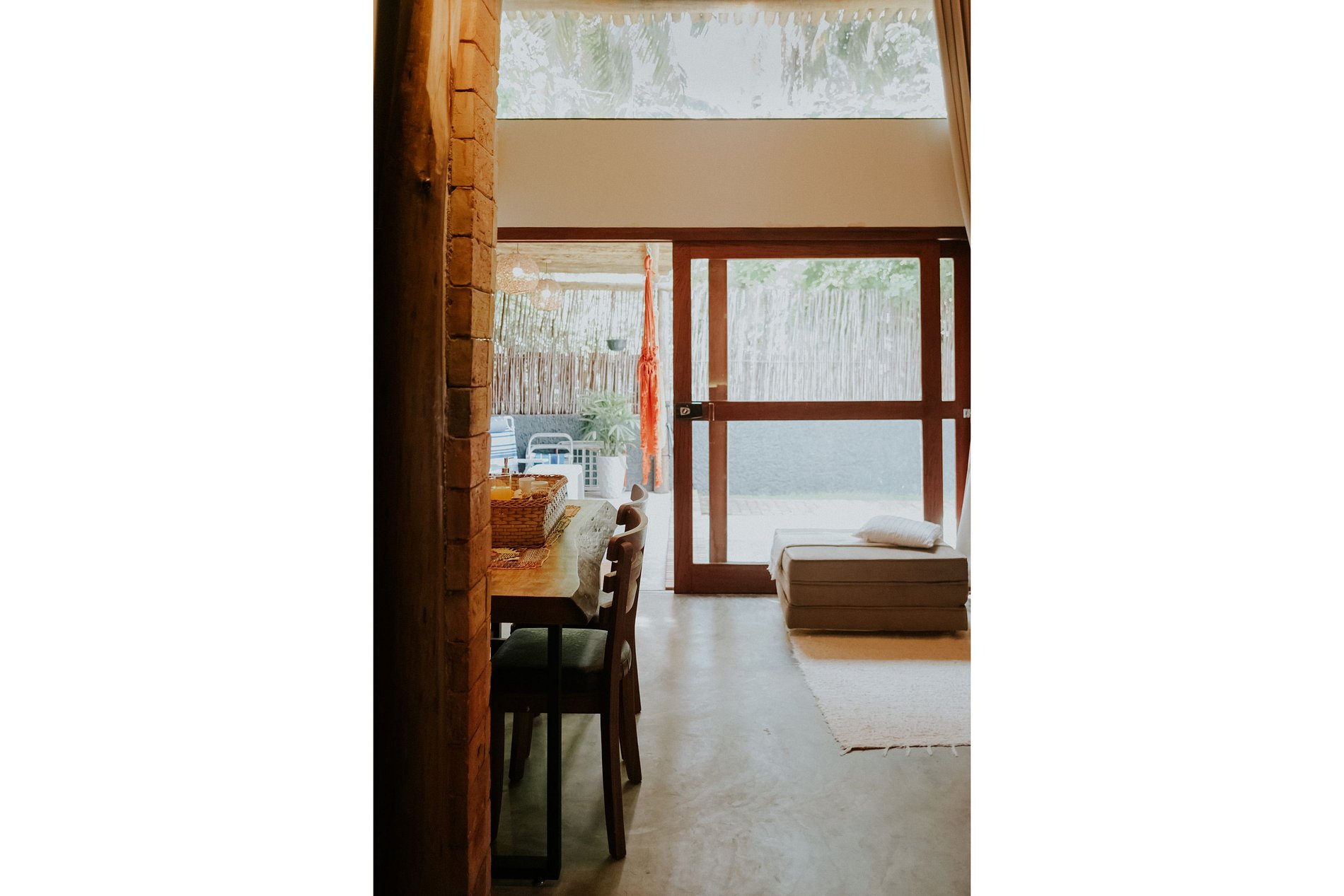 O espaço interno do bangalô contempla um pavimento térreo com quarto com cama queen, sala de jantar e estar com um confortável puff futon que pode ser utilizado como cama de solteiro, cozinha e banheiro, além de um pavimento superior que consiste em um charmoso mezanino de madeira, com acesso através de uma escada Santos Dumont, contemplando mais um dormitório, também com cama queen e um segundo banheiro privativo.