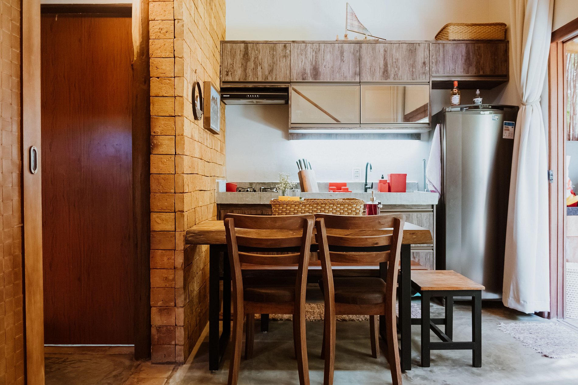 O espaço interno do bangalô contempla um pavimento térreo com quarto com cama queen, sala de jantar e estar com um confortável puff futon que pode ser utilizado como cama de solteiro, cozinha e banheiro, além de um pavimento superior que consiste em um charmoso mezanino de madeira, com acesso através de uma escada Santos Dumont, contemplando mais um dormitório, também com cama queen e um segundo banheiro privativo.